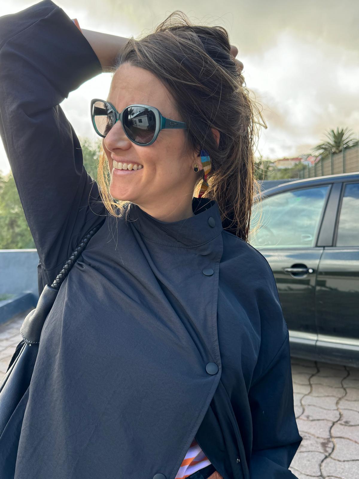 Su cierre frontal cruzado con botones a presión, cuello camisero con posibilidad de llevarlo cerrado o abierto, y mangas amplias aportan carácter y funcionalidad. Incluye bolsillos laterales discretos y un forro interior ligero para mayor confort.
